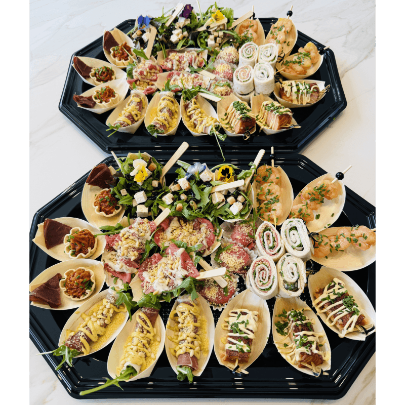 Wil jij wat luxere hapjes bestellen dan onze standaard hapjes? Kies dan voor onze luxe hapjesschaal. De luxe hapjesschaal bevat 25 of 50 luxe hapjes in 8 verschillende varianten. Ieder hapje is zorgvuldig samengesteld, mooi opgemaakt en bevat luxe ingrediënten. Van verfijnde carpaccio bonbons en prosciutto rolletjes tot heerlijke garnalenspiesjes en warm gerookte zalm. Deze schaal biedt voor ieder wat wils. Vlees, vis én vegetarisch, allemaal vers bereid en direct serveerklaar.